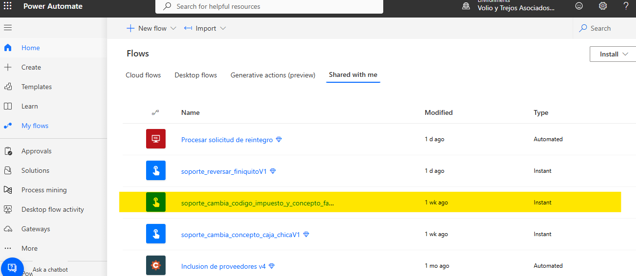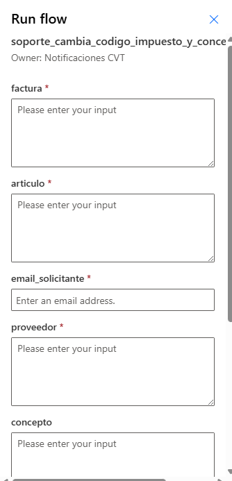 - Ir a flujos, Shared with me e iniciar soporte_cambia_codigo_impuesto_y_concepto_facturaV1