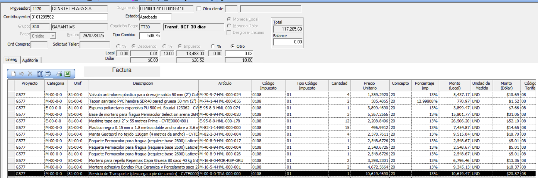 articulo: artículo de la línea a la que se le desea cambiar datos. Ejemplo de imagen M-70-9-7-HML-000-024